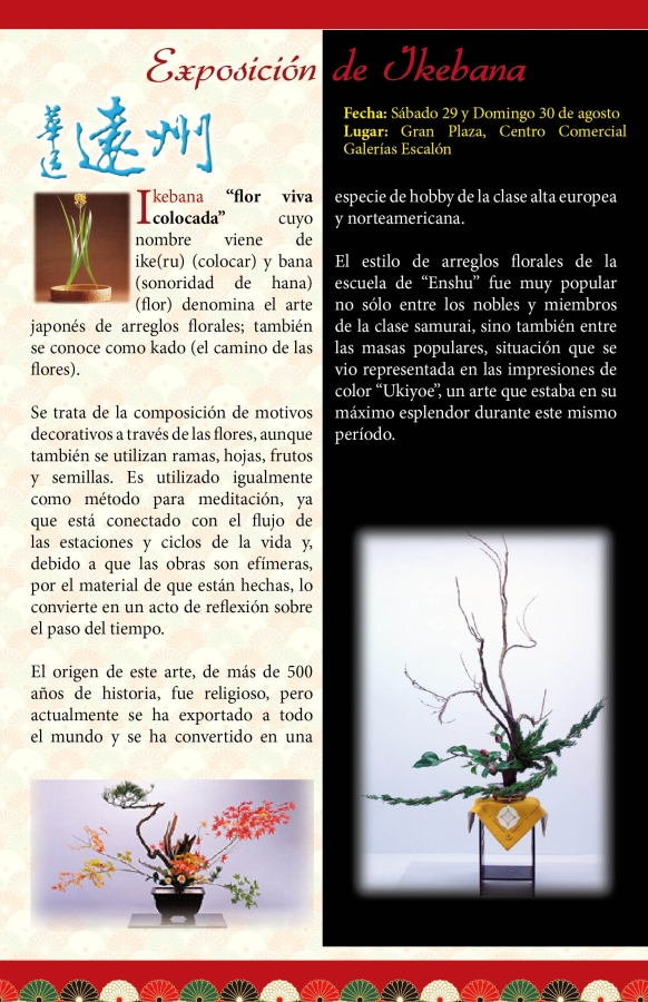 Ikebana "flor viva colocada" cuyo nombre viene de ike(ru) ( colocar ) y bana (sonoridad de hana ) ( flor ) denomina el arte japonés de arreglos florales ; también se conoce como kad o ( el camino de las flores ).